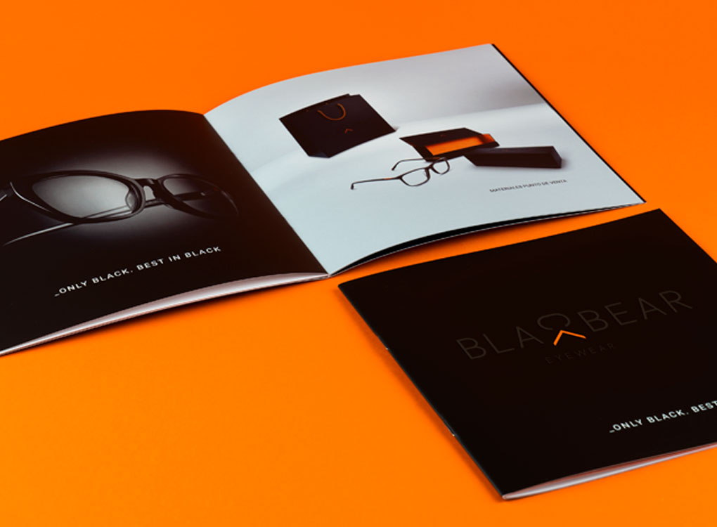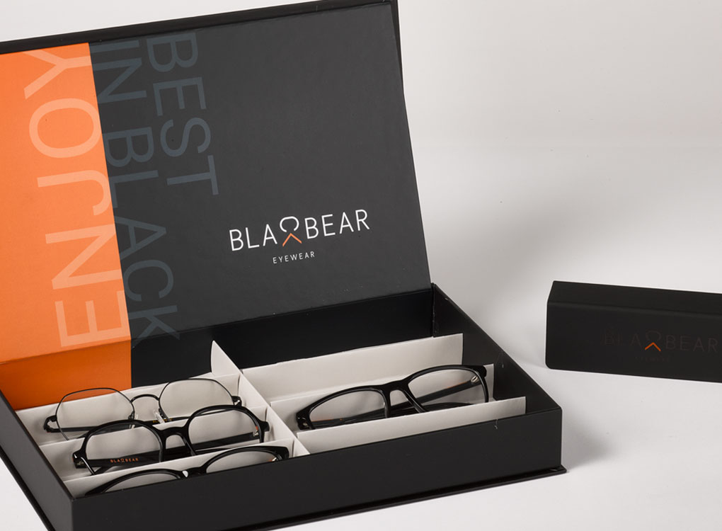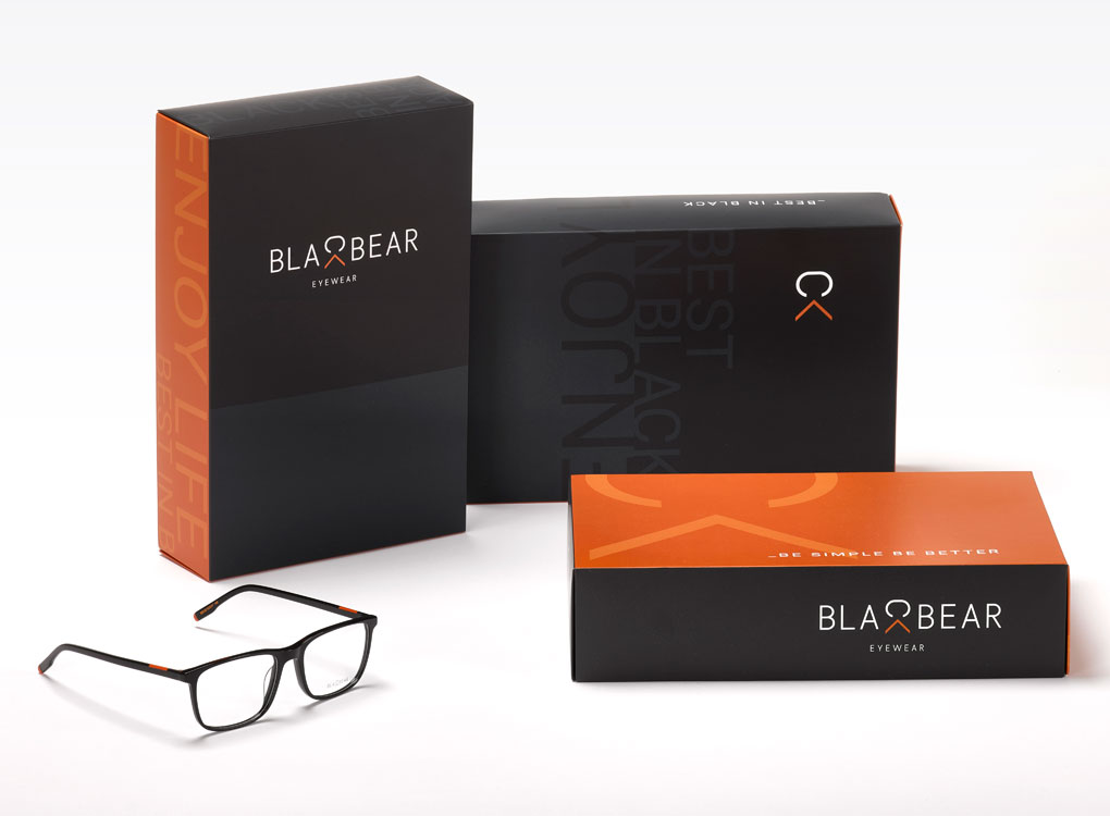 ¿Cómo creamos un packaging para enviar las gafas a los ópticos y que a la vez sirva como display publicitario en el punto de venta? Diseñamos 4 modelos de cajas de automontaje de tapa y base, con los dos colores corporativos, el negro y el naranja, que permiten hacer diferentes composiciones en el escaparate.